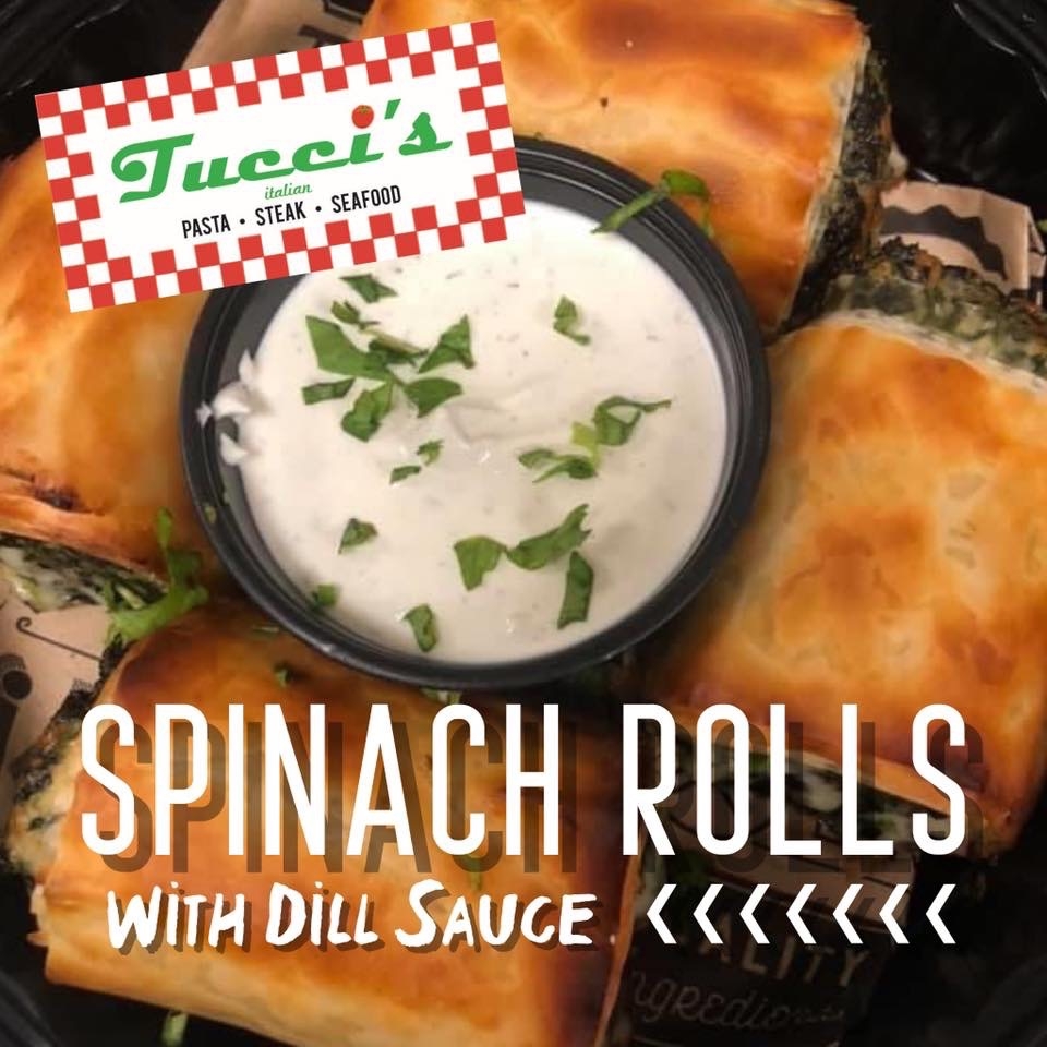 Light flaky phillo dough rolled with spinach and cheese blend baked golden brown served with dill sauce